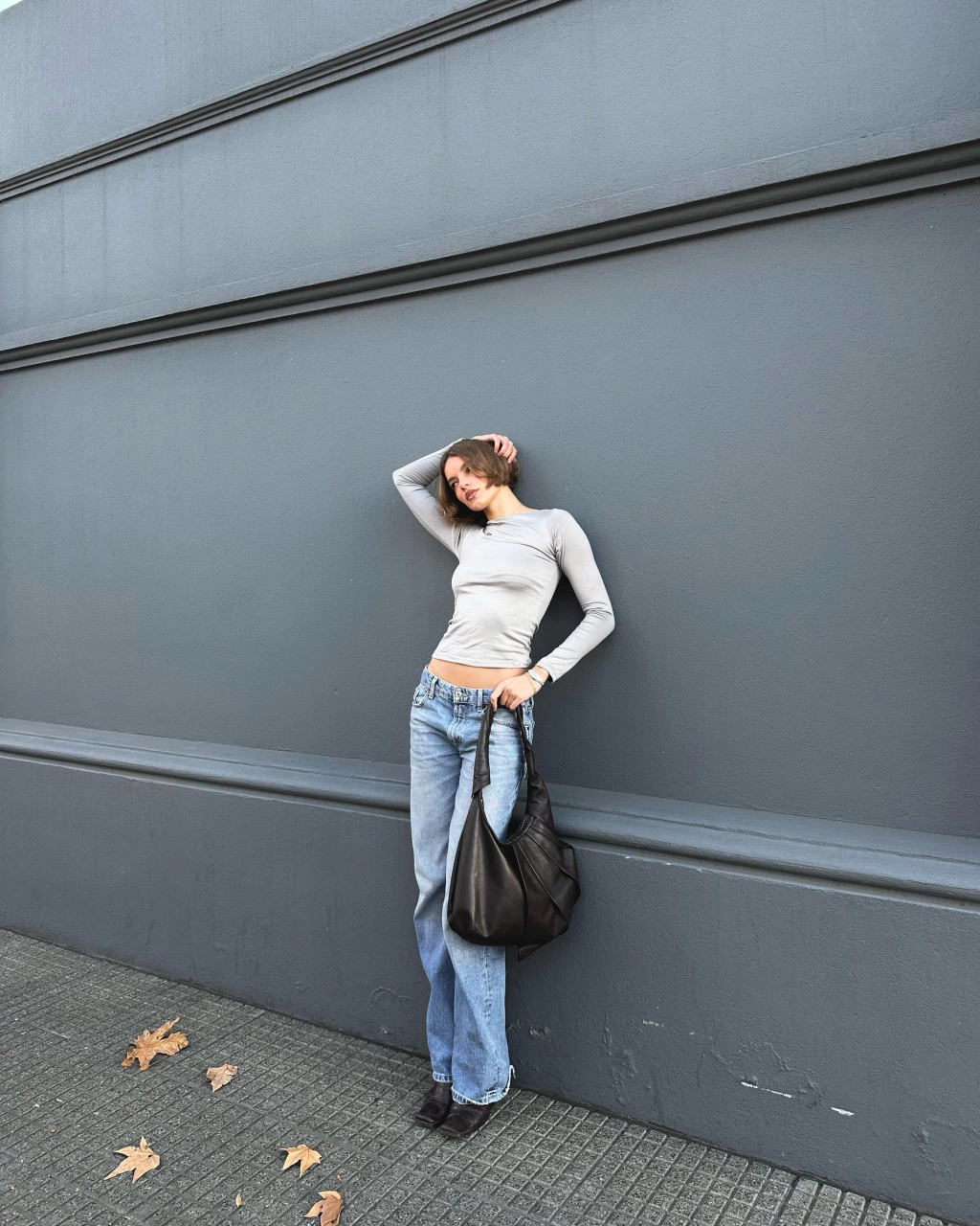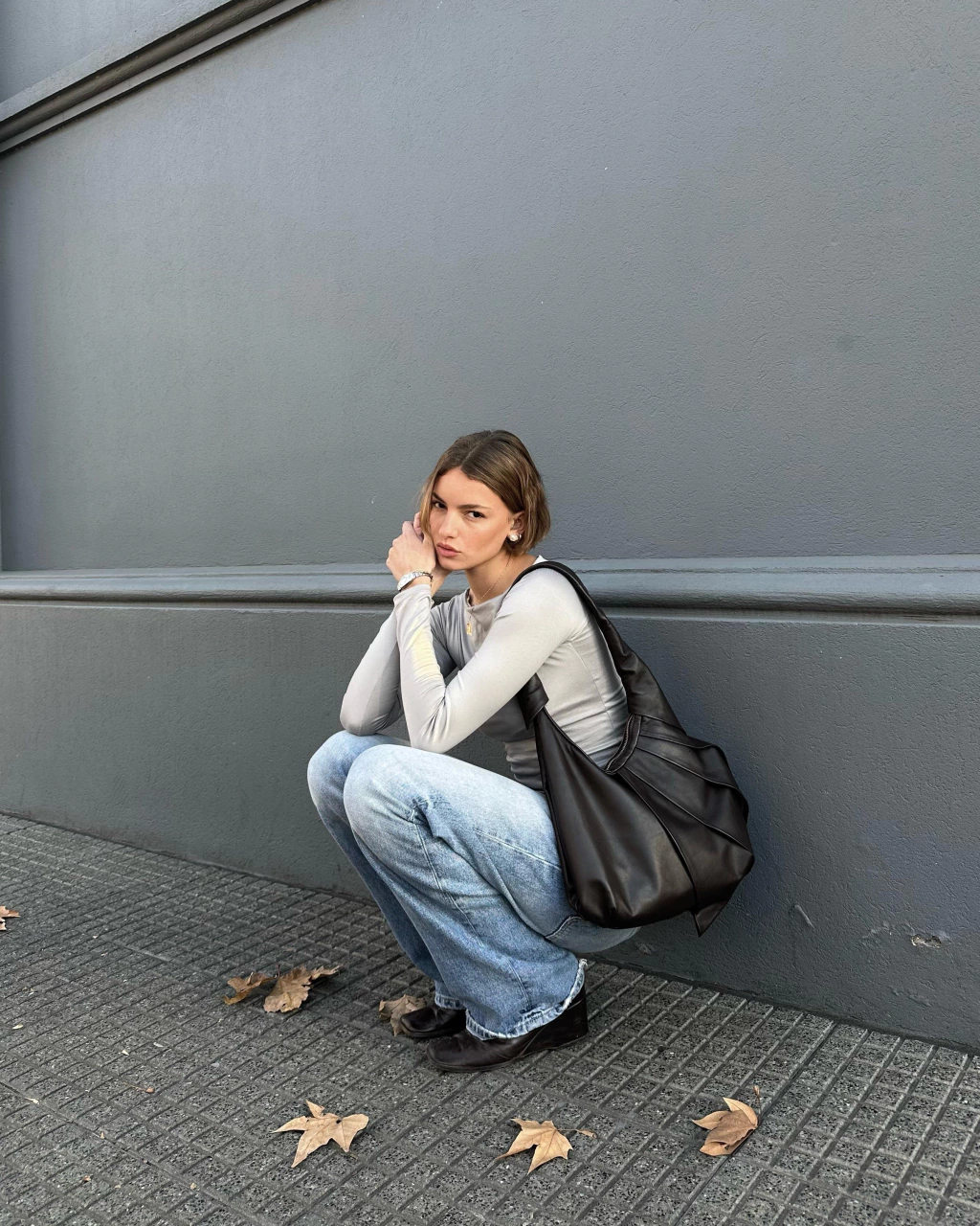 Cartera de cuero vacuno con diseño de escamas en ambas caras. Su tamaño es ideal para usar todos los días ya que tiene un tamaño intermedio. La manija es fija y se lleva al hombro.